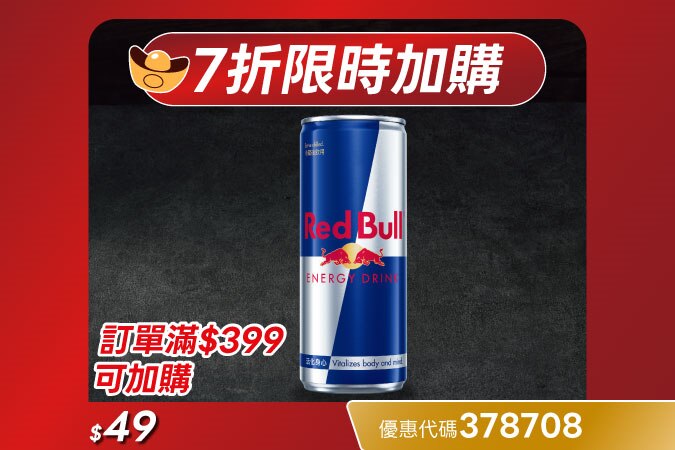 2/22前訂單滿399元,可7折加購一罐紅牛能量飲料,限一筆訂單用一次